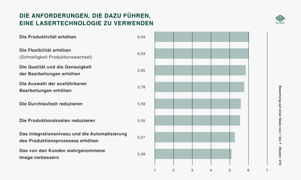 In der folgenden Tabelle werden die Ergebnisse der Go-To-Market-Analyse angegeben: Increasing effectiveness in value proposition, die im April/Mai 2017 an einem Gesamtmuster von 397 Mustereinheiten durchgeführt wurde (Laserkunden BLM Group / Laserkunden der Konkurrenzmarken / Nichtlaserbenutzer.