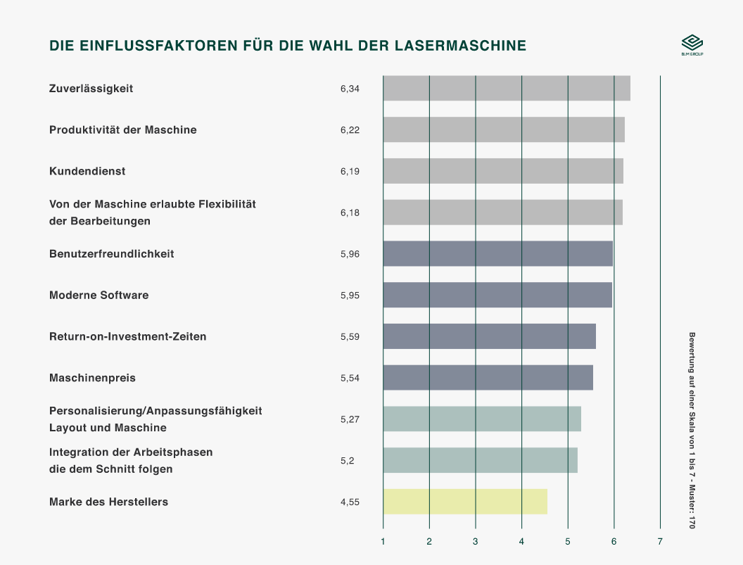 In der folgenden Tabelle können wir einige Ergebnisse der Go-To-Market-Analyse sehen: Increasing effectiveness in value proposition, die im April/Mai 2017 an einem Gesamtmuster von 397 Mustereinheiten durchgeführt wurde (Laserkunden BLM Group / Laserkunden der Konkurrenzmarken / Nichtlaserbenutzer). Es ist einfach zu erkennen, dass die Einflussfaktoren, die die Wahl einer Lasermaschine bestimmen, zahlreich und untereinander sehr verschieden sind.