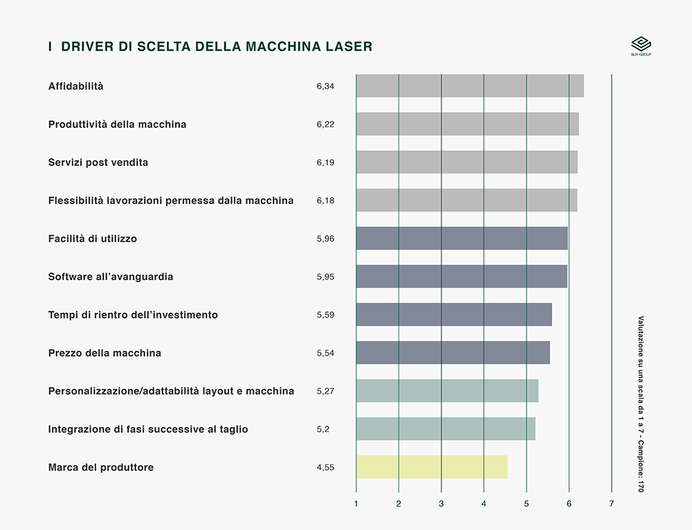 Nella tabella che segue, possiamo vedere alcuni risultati dell'analisi Go-To-Market: Increasing effectiveness in value proposition, svolta tra aprile e maggio 2017 su un campione complessivo di 397 unità campionarie (clienti laser BLM Group / clienti laser di brand competitor / non utenti laser). Come si evince facilmente, i driver che orientano la scelta di una macchina laser sono molteplici e tra loro molto diversi.