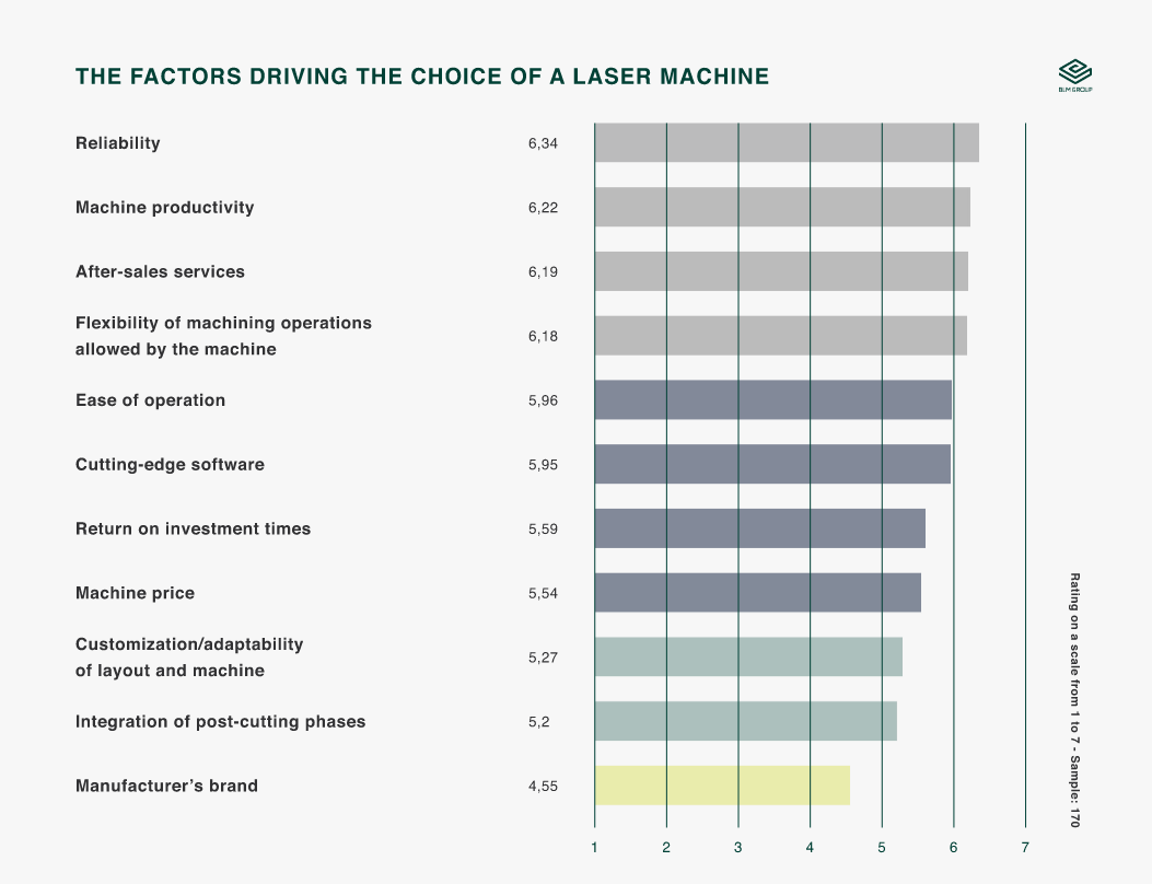 The following table shows some results of the Go-To-Market analysis: Increasing effectiveness in value proposition, conducted from April to May 2017 on a total sample of 397 units (BLM Group laser customers / competitor brand laser customers / non-laser users). As you can see, there are many common factors that drive the choice of a laser machine.